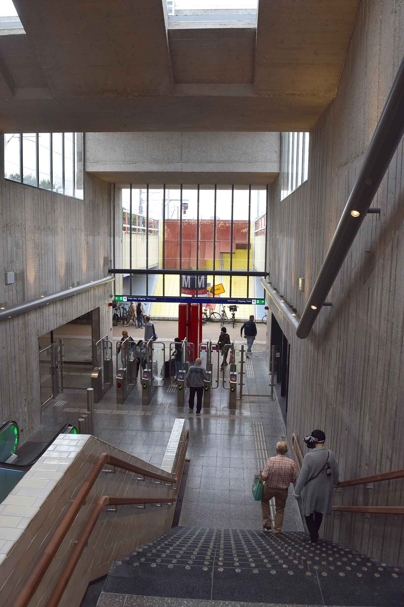 Gelukkig is er ook goed nieuws. De metro-ingang in dit gebied is inmiddels geheel opgeknapt, lekker fris en open, en de muren van brut beton zijn ontdaan van al hun verflagen (zie foto 1). Jammer is wel dat de ruimte net buiten het station er gewoon nog groezelig, uitgewoond en outdated uitziet, inclusief het kunstwerk van Shlomo Koren (het gekrulde staal), dat indertijd de bewoners moest helpen de metrolijn als iets goeds en moois te zien (de belangrijkste reden voor al die kunstwerken in en bij de stations van lijn 53 en 54). De metro ingang bij het AMC wordt momenteel onderhanden genomen (laatste foto). En verder buiten kondigt zich een andere herschepping aan. Er is al een oud kantoor paarsblauw geverfd en omgeturnd tot studentenhuisvesting; het verloederde, immense kantorencomplex gaat tegen de vlakte; en er komt van alles nieuw, inclusief horeca, sport en meer design.