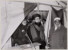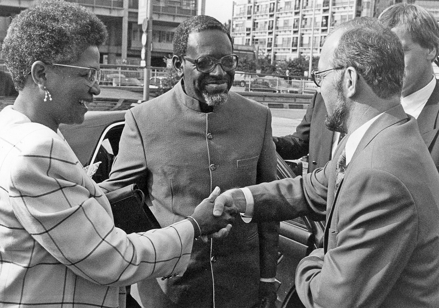 PvdA-leider tijdens een verkiezingstournee de Bijlmer, waarvoor hij in de jaren ‘60 als Amsterdams Wethouder de 1ste politiek verantwoordelijke was. Naast hem, rechts, Chas Warning, indertijd baas van Kwakoe. Helemaal links met zonnenbril: Roy Mungra