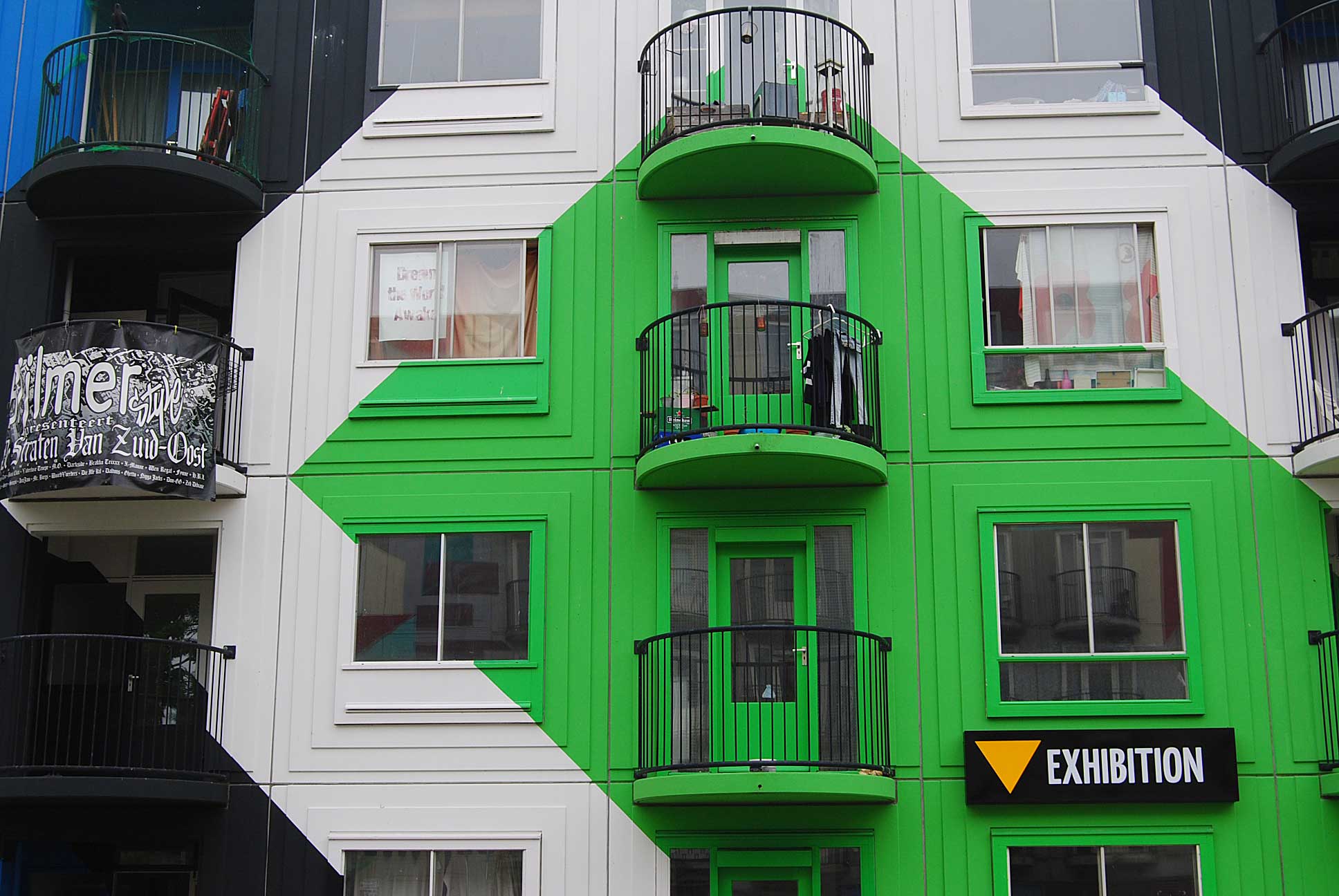 In de Bijlmer hebben we Heesterveld, ooit de risee van de Amsterdamse volkshuisvesting, ooit bestemd tot sloop, maar inmiddels voor een derde een kunstenaarskolonie, knalhard geverfd in schitterende patronen, met kleine. sociale onderneminkjes op de begane grond, voorzien van opvallende naams aanduidingen.